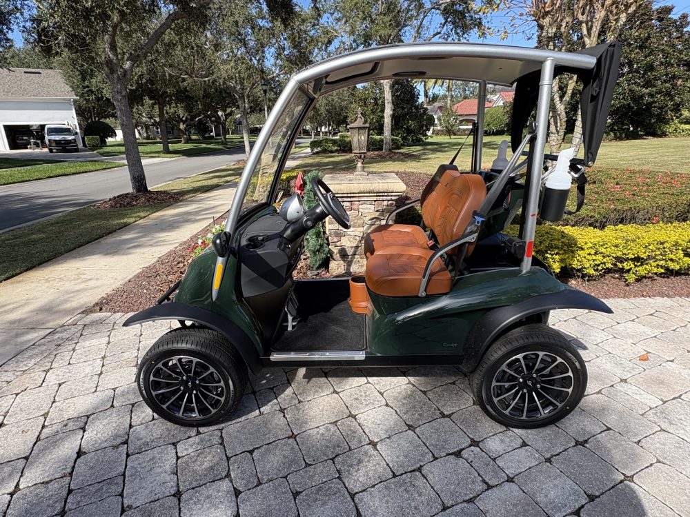 • PREMIUM DESIGN PACKAGE ( GREEN BODIES, FRIDGE, 15″ SHINY BLACK CUT WHEELS, AND WALNUT PREMIUM OAK SEATS)